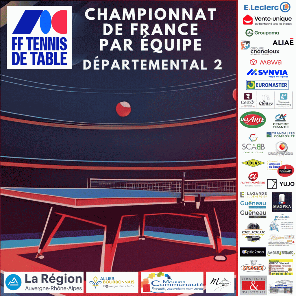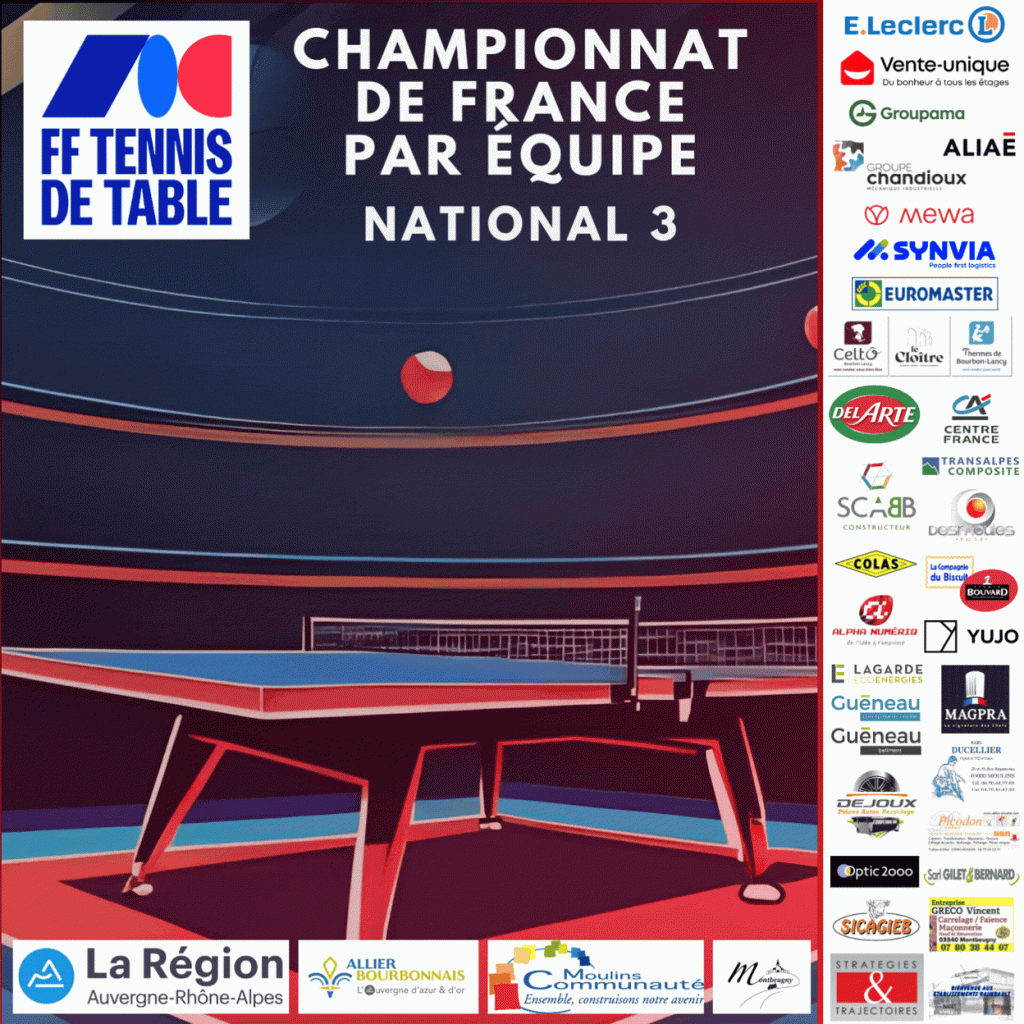 L’équipe 1 revient de son déplacement à NEUVES MAISONS 1 avec une victoire 4 à 8, imitée par l’équipe 5, 6 à 8 face à ASPTT MONTLUçON 5. Les équipes 2 et 3 s’inclinent lourdement respectivement face à ST GERMAIN DES FOSSES 1 (3 à 11) et TT LAPALISSE 2 (1 à 13).